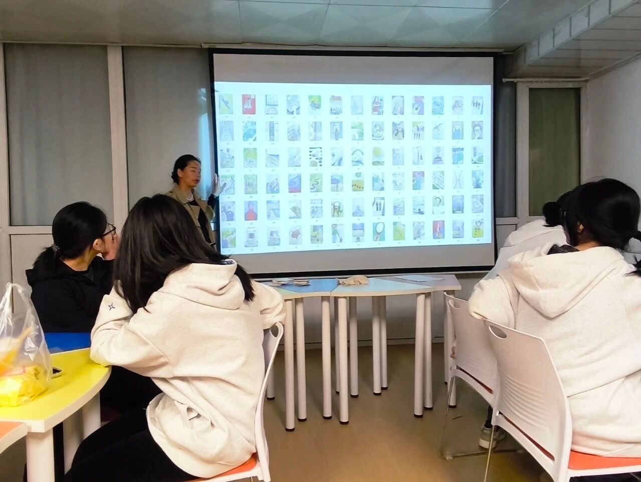 活动中,张老师通过“我的名片”等互动环节,引导学生结合图卡进行自我介绍,表达当下的心情与对专业的第一印象,并分享对未来的生涯期待。在“我的名片”环节,学生们从众多图卡中挑选最能代表自己的卡片,结合卡片图案与色彩,讲述自己的故事与感受。有的学生选择象征希望的向日葵图卡,表达对专业的热情与期待;有的学生则以宁静的蓝色图案,传递内心的沉稳与思考。张老师耐心倾听每一位学生的分享,适时给予引导与鼓励,帮助学生在表达中梳理自我认知。此外,活动还设置了小组讨论与互动游戏,学生们在轻松的氛围中交流想法,碰撞思维火花,进一步深化对自我与生涯的理解。